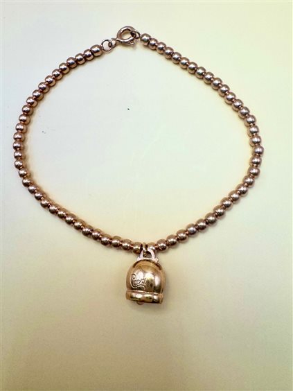 BRACCIALE IN ARGENTO ROSATO CON SFERE E CAMPANELLA PENDENTE, ACCOMPAGNATO DA LEGGENDA DI SAN MICHELE ARCANGELO, DONATORE DELLA FAMOSA CAMPANELLA PORTAFORTUNA