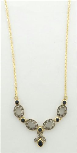 Collana donna in oro giallo 18 kt , girocollo maglia rollo , lunghezza cm 46 , centrale con 36 rose di diamante certificati , 5 zaffiri rotondi , 1 zaffiro a goccia. Immagine indicativa , la confezione può variare di forma e colore.