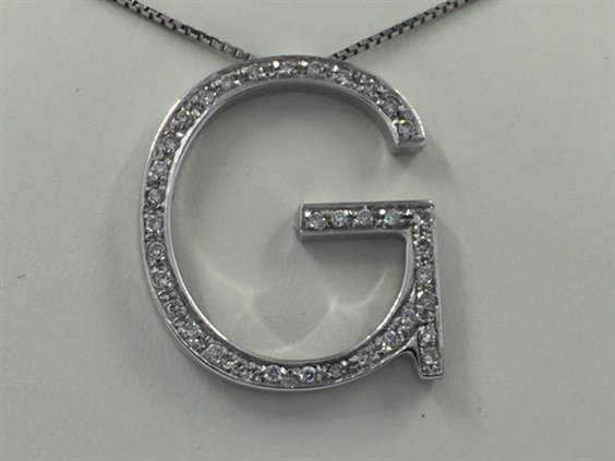Collana oro bianco 18Kt con ciondolo a forma di lettera G in oro bianco con pavè di diamanti per kt 00,40