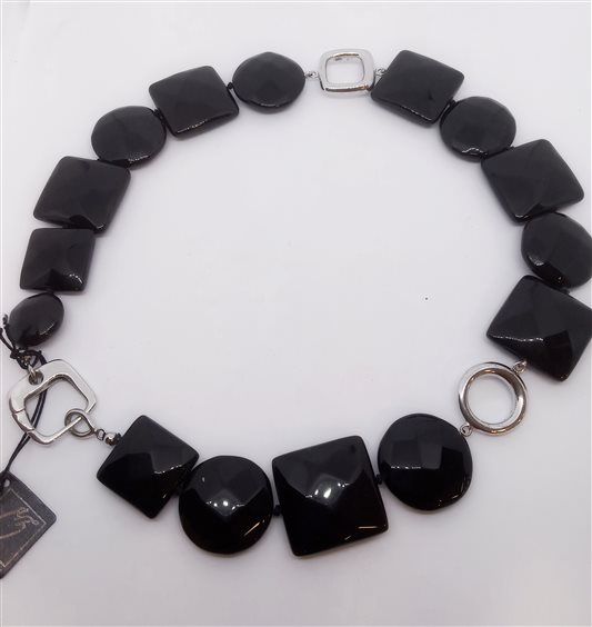 Collana in pietre dure e argento. Girocollo con pastiglie sfaccettate in onice 2.5 cm. Elementi in argento rodiato e chiusura con grande moschettone quadrato.
