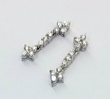 Orecchini donna Artigianali pendenti a perno in oro bianco con 22 diamanti taglio brillante Vs/H snodati nel punto luce (4 diamanti) e nella parte terminale. Lunghezza orecchino 18 mm. larghezza 2/4,5 mm. spessore 3,2/5 mm. Scatola e certificato di garanzia del negozio.