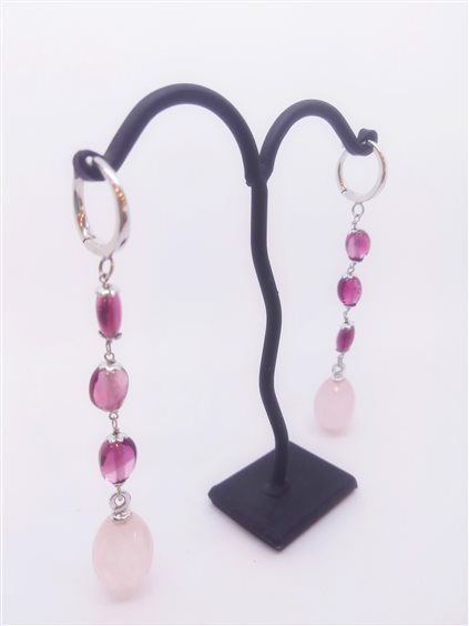 RZ UNICOLOR PEZZI UNICI A PREZZI UNICI (ultimi pezzi di collezioni esaurite) Orecchini in oro bianco rodiato 24 carati con tre ovali asimmetrici in spinello color ciliegia pallido taglio cabochon (0.4cm ca) incatenati a goccia sfaccettata in quarzo rosa pallido (1.3 cm). Chiusura a scattino. Raffinata lavorazione orafa artigianale.