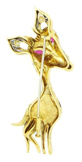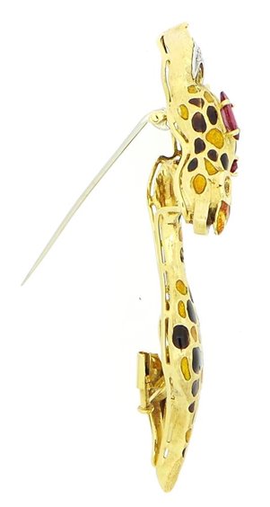 Spilla in oro giallo 750 con smalti vitrei a fuoco color giallo/bruni 2 rubini taglio navette ct 0.28 (approssimativi) e diamanti taglio huit huit ct 0.06 - peso g. 23.50 totali - misure mm 7.00 x 3.20.