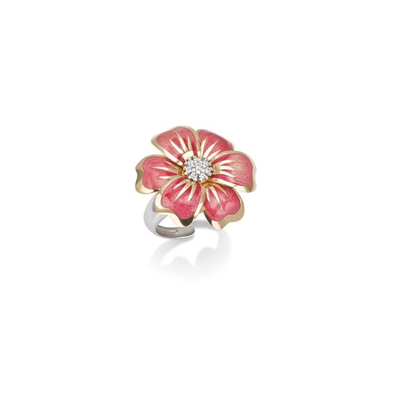 ANELLO ARTLINEA IN ARGENTO BIANCO E FIORE SMALTATO ROSA CON ZIRCONI CENTRALI E BORDI PLACCATI IN ORO GIALLO.MISURA REGOLABILE