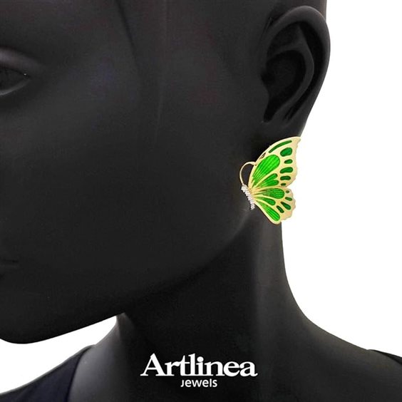 Orecchini in argento 925 dorato a forma di farfalle smaltate sulle ali nei colori della tonalità giallo/verde ed impreziositi da cubic zirconia