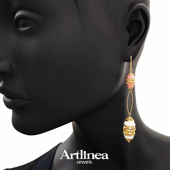 orecchini Artlinea pendenti in argento dorato e smalto rosa e bianco