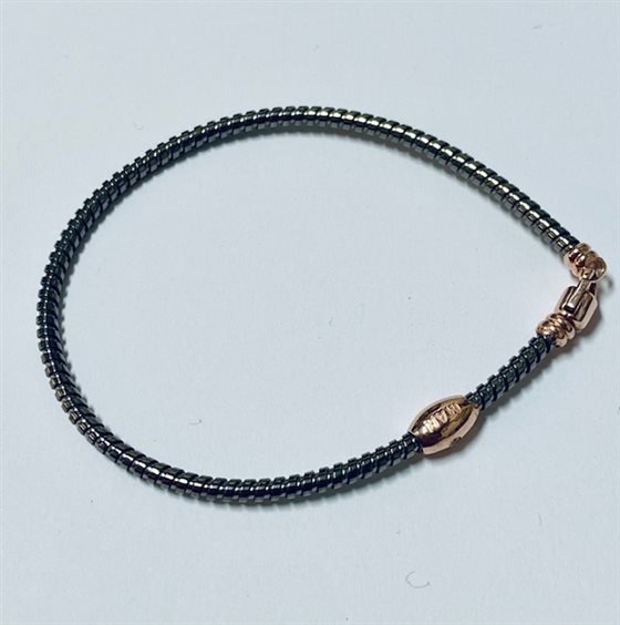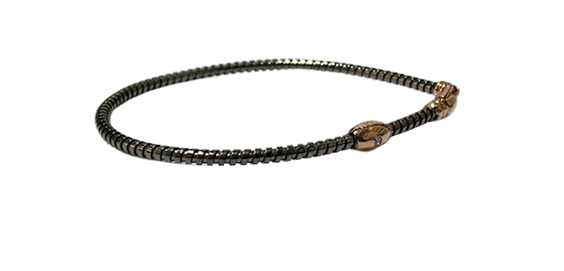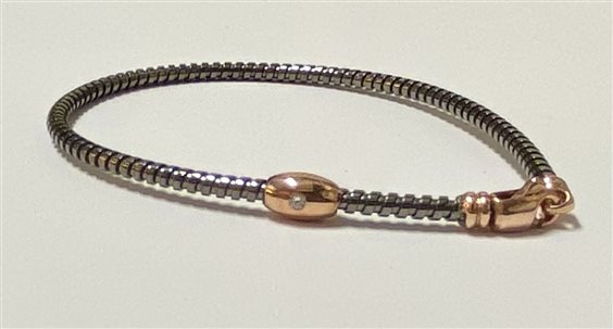 Bracciale in argento 925 marca "Auritalia " completamente realizzato in Italia. La maglia è tubolare e viene chiamata "tubo gas" con finitura brunita. Il moschettone di chiusura e il barilotto sono placcati in oro rosa 18 kt. Sul barilotto è incastonato uno zircone bianco simbolo di eleganza e originalità della collezione "Brave Man"