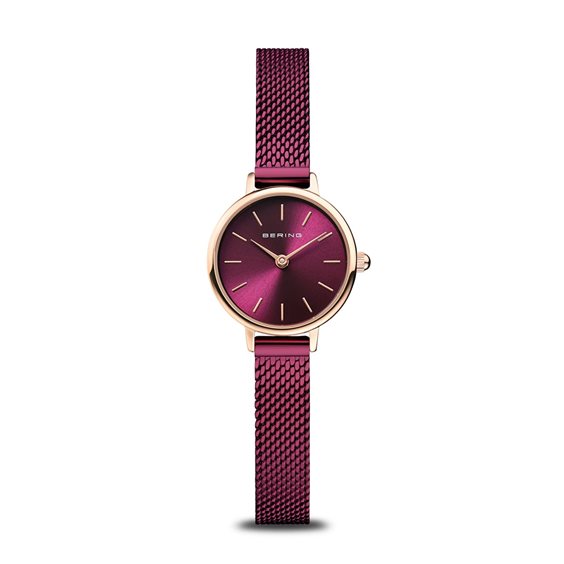 Classico, purista, eppure eccitante. Stile perfetto combinato al minimalismo contemporaneo. Ispirata al design danese, la COLLEZIONE CLASSIC presenta un orologio unico, creato per dare un tocco di stile al look quotidiano. La cassa in acciaio inox (316L), finitura brillante, insieme al moderno cinturino in maglia Milanese in tinta col quadrante, realizzano il classico look BERING. Il quadrante color porpora, impreziosito da elementi Swarovski, è protetto da un vetro zaffiro antigraffio. Garanzia 3 anni.