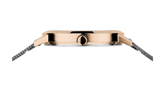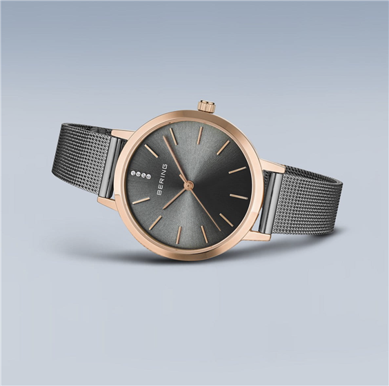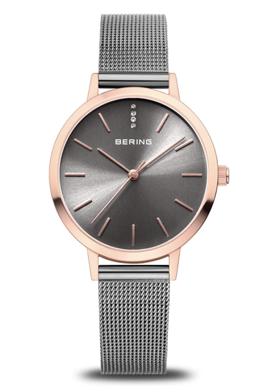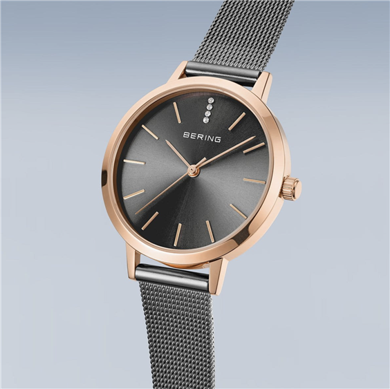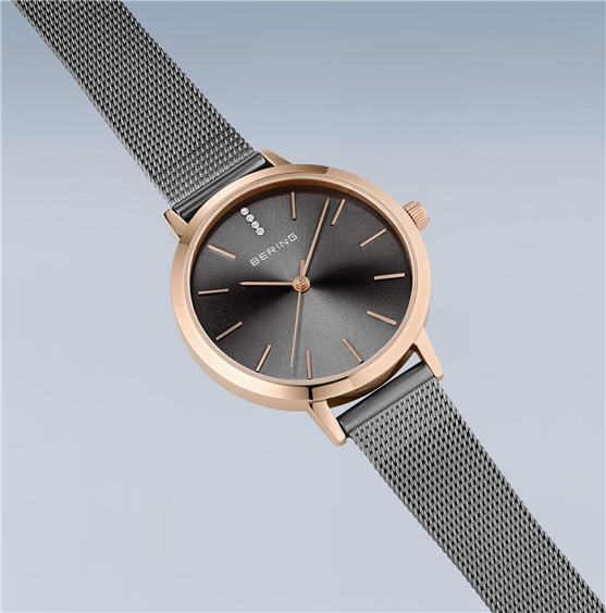 Questo modello della collezione BERING Classic unisce raffinatezza femminile e design minimalista. La cassa in acciaio inox lucido color oro rosa si abbina perfettamente al quadrante grigio con finitura sunray, che offre una profondità delicata e riflessi di luce eleganti, conferendo all’orologio un aspetto particolarmente sofisticato. Quattro cristalli finemente incastonati a ore 12 aggiungono un tocco di grazia che esalta il carattere elegante del modello. Le lancette e gli indici in tonalità oro rosa riprendono armoniosamente il colore della cassa, creando un bel contrasto con le tonalità fredde del quadrante grigio. Il vetro zaffiro piatto e antigraffio protegge il quadrante nel tempo, garantendo una chiarezza duratura. Il cinturino milanese finemente intrecciato in grigio opaco si adatta dolcemente al polso e offre un comfort eccellente grazie alla pratica chiusura a scatto. All’interno, un preciso movimento al quarzo assicura un’indicazione affidabile dell’ora, mentre la resistenza all’acqua fino a 3 ATM rende l’orologio perfetto per l’uso quotidiano.