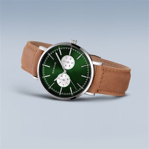 Ispirata al design danese, la COLLEZIONE CLASSIC presenta un orologio unico, creato per dare un tocco di stile al look quotidiano. La cassa in acciaio (316L), la finitura lucida, insieme al cinturino in pelle morbidissima, realizzano il classico look BERING. Il quadrante verde, con i due contatori bianchi dei datari, è protetto da un vetro zaffiro antigraffio. Garanzia 3 anni.