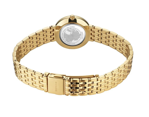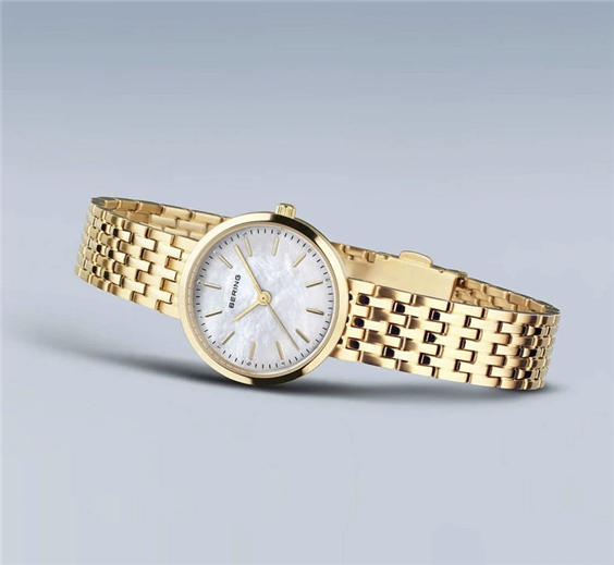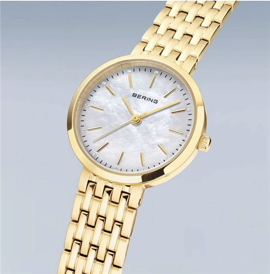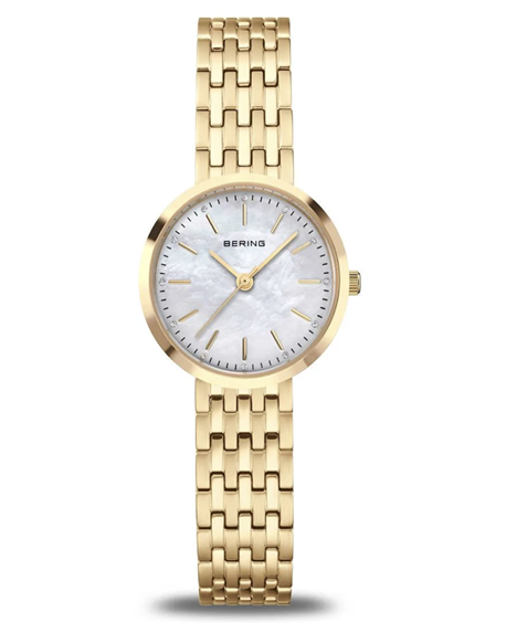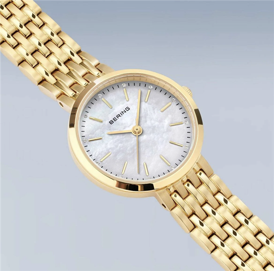 Armonia luminosa – un elegante duo di orologio e bracciale Questo orologio da donna della collezione Classic di BERING è più di un semplice accessorio: è un’affermazione di stile. L’acciaio inox dorato e il quadrante in madreperla bianca conferiscono un’eleganza leggera e raffinata. Abbinato a un sottile bracciale dorato coordinato, dà vita a un set che esprime pura raffinatezza. La cassa rotonda da 26 mm di diametro e soli 7 mm di spessore appare delicata ma decisa. Il quadrante in vera madreperla riflette la luce con una brillantezza naturale, impreziosito da indici e lancette dorate. Il vetro zaffiro piatto, resistente ai graffi, protegge il quadrante, mentre il movimento al quarzo assicura precisione e affidabilità. Particolarità del modello: il bracciale in acciaio dorato è arricchito da elementi in ceramica di alta qualità – un contrasto moderno di materiali che aggiunge comfort e stile. La chiusura a scomparsa completa il design in modo funzionale. Resistente all’acqua fino a 5 ATM, è il set perfetto per ogni momento della giornata.