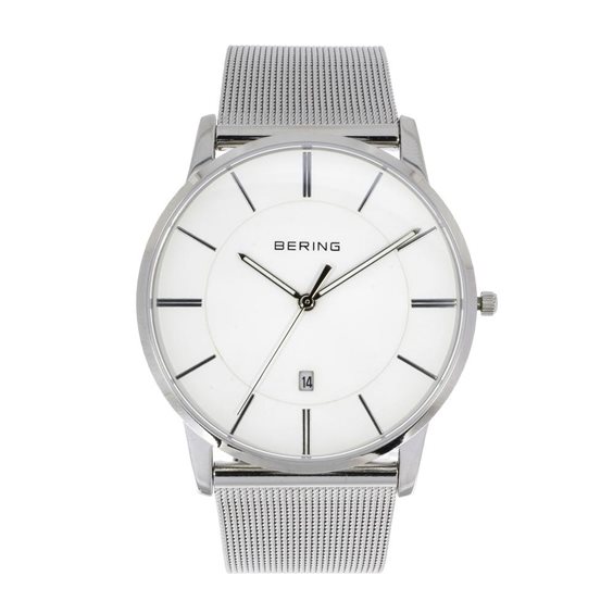 Orologio Solo Tempo Unisex Di Bering Della Collezione Classic. Orologio Con Cassa Della Dimensione Di 39 Mm, Di Colore Argento Brillante E Realizzata In Acciaio Inox. Modello Con Cinturino Di Colore Argentato, Realizzato In maglia Milano, Con Chiusura A Scatto. Questo Orologio Ha Quadrante Bianco, Con Vetro Zaffiro. Modello Con Movimento Al Quarzo E Resistenza All'Acqua Di 5 Atm. Caratteristiche Aggiuntive: 3 Anni Di Garanzia, Data. La Referenza È 13139-000 Questo solo tempo verrà spedito con Scatola Originale Bering