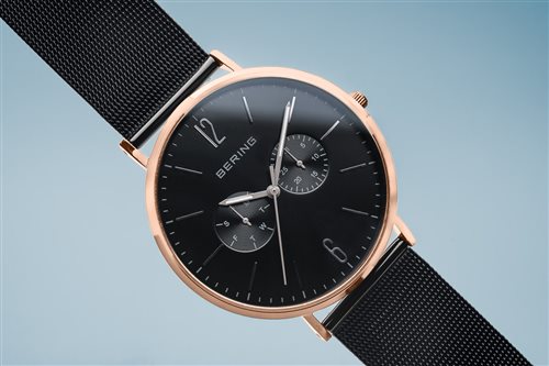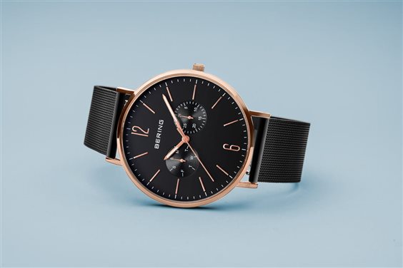 Ispirata al design danese, la COLLEZIONE CLASSIC presenta un orologio unico, creato per dare un tocco di stile al look quotidiano. La cassa in acciaio inox 316L laminato oro rosa, insieme al moderno cinturino in maglia Milano nero, realizzano il classico look BERING. Gli indicatori multifunzione integrati (giorno/data) e gli indici in color oro rosa completano il quadrante alla moda. Il vetro zaffiro cristallino, antigraffio e particolarmente resistente garantisce la visione chiara del quadrante. Garanzia 5 anni.
