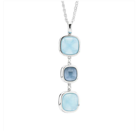Collana bronzo rodiato con pendente di cristalli medi e piccolo azzurro lattiginoso e acquamarina. diametro cristalli cm. 1.5