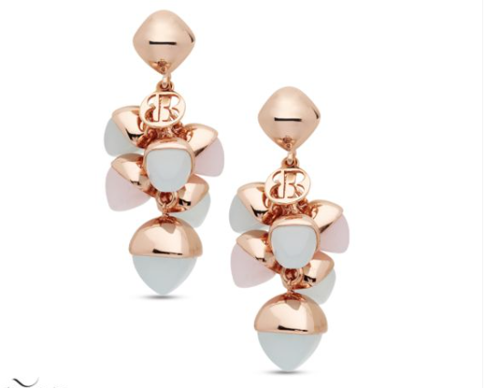 Orecchini placcati oro rosa con ciuffo di cristalli piramidali color quarzo rosa e acquamarina.