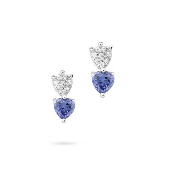 Orecchini in argento rodiato con due zirconi a cuore di colore bianco e tanzanite e zirconi. Materiale: argento Produzione: realizzato in Italia Dimensione: lunghezza cm 1 Chiusura: a farfalla Garanzia: 2 anni