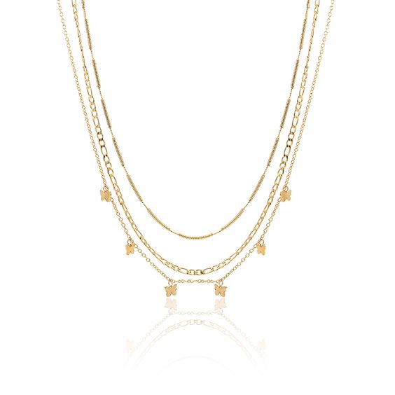 Collana triplo filo con farfalle pendenti PVD dorato Lunghezza 40, 42, 45 + 8 cm di estensione. Materiale: Acciaio inossidabile, ipoallergenico e testato per il nichel