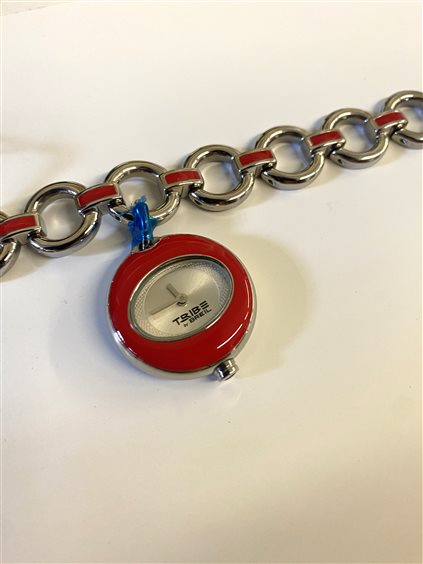 Orologio Breil Tribe Charmy, cassa a ciondolo rotonda di diametro 25 mm in acciaio con smalto rosso, bracciale in acciaio con dettagli in smalto rosso. Vetro minerale leggermente bombato. Fondello a pressione in acciaio.