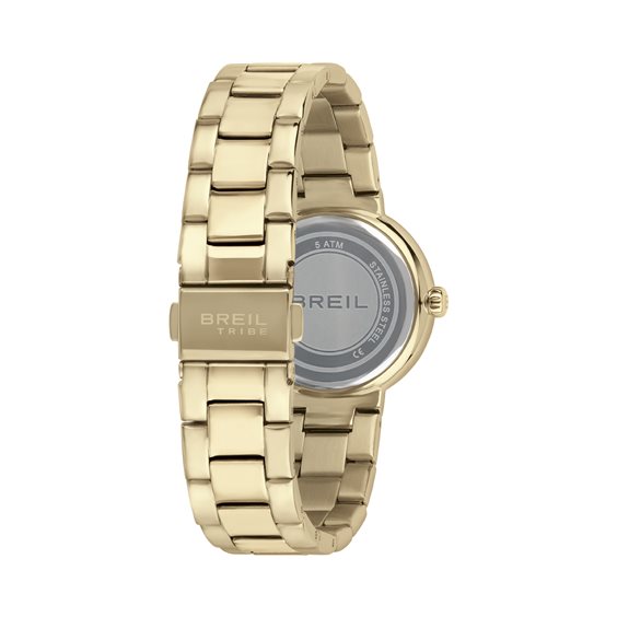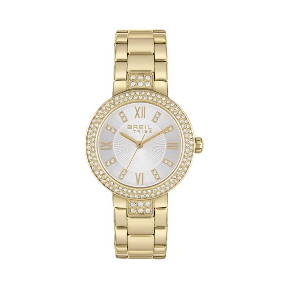 L'orologio solo tempo femminile in acciaio IP gold Dance Floor è caratterizzato da sfavillanti cristalli che decorano la lunetta, le anse e gli indici a bastoni intervallati dalle romane. L'allure classica è bilanciata da quadrante bianco, che rende questo orologio decisamente contemporaneo.