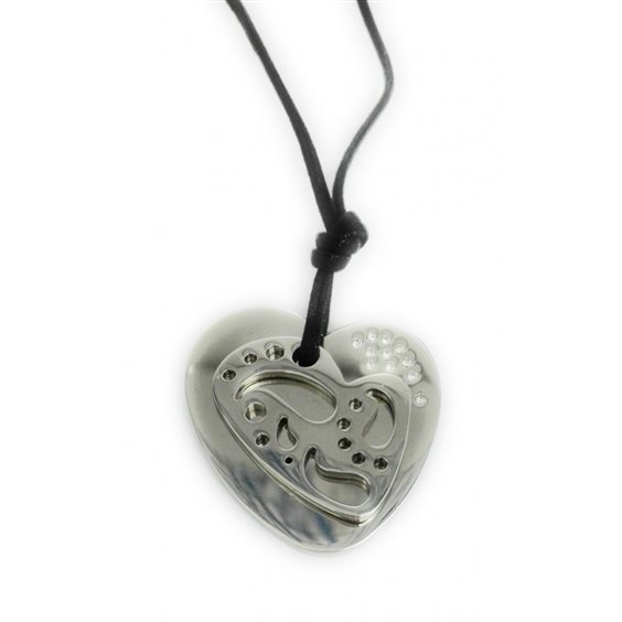 Collana in acciaio ideata e realizzata da Tribe by Breil, il pendente, a forma di cuore, è impreziosita da zirconi bianchi, misure 4 x 3,5 centimetri, il cordoncino è realizzato in cotone cerato nero.