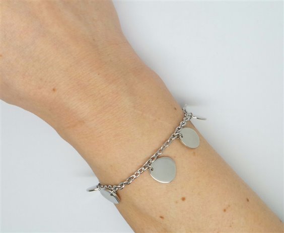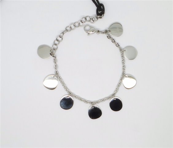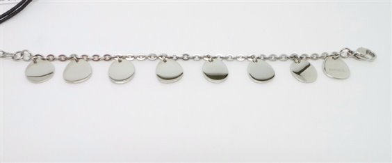 bracciale in acciaio anallergico lucido con catenina rolò e pendenti a goccia distribuiti su tutta la lunghezza e lucidi in ambo i lati. Chiusura a moschettone regolabile: misura minima 14,50 cm, misura massima 20 cm