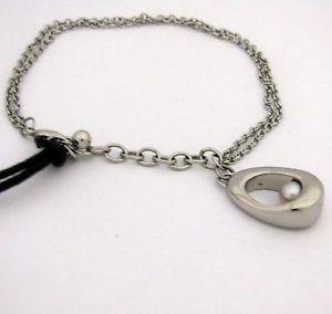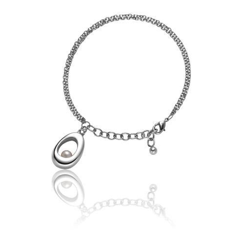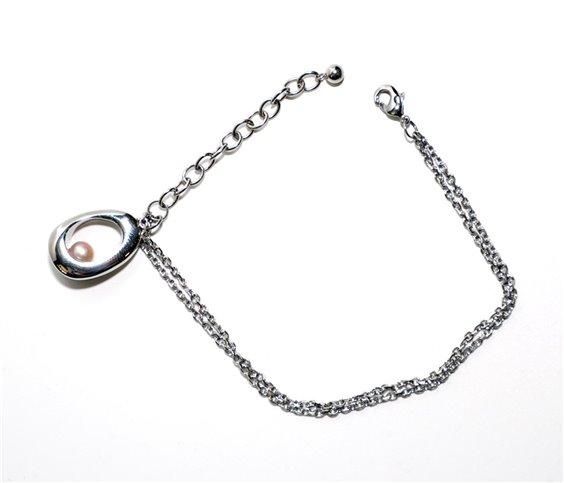 Bracciale in acciaio con pendente a goccia di misura mm 20 x 14 e perla coltivata di fiume di colore rose' di mm 5, maglia doppia con lavorazione rolo lunghezza massima catena 20 cm. Possibilita' di essere accorciato con ausilio degli anellini.