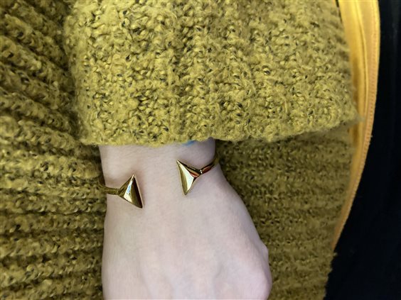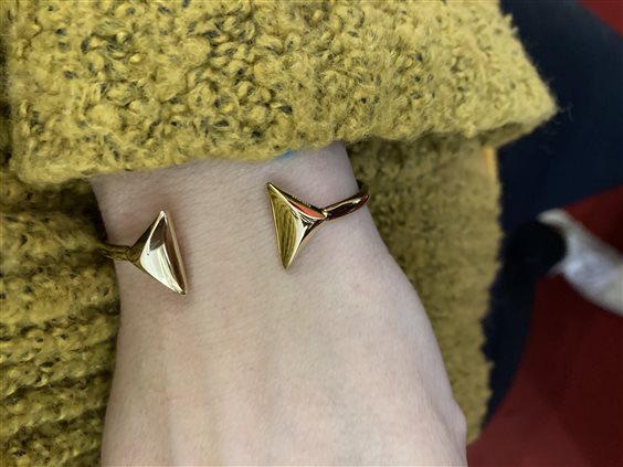 Bracciale rigido in acciaio dorato con due finali triangolari 3d.