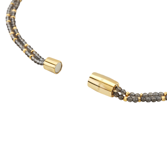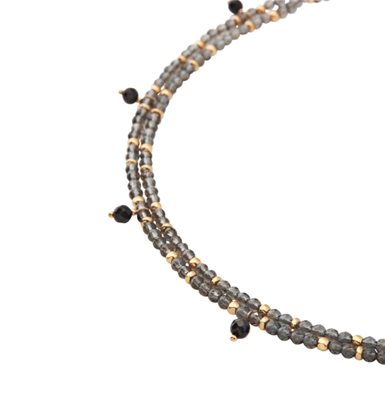 Il girocollo NY Skyline è composto da due catene di cristalli fumè con micro sfere in acciaio color oro e 7 charms in agata nera