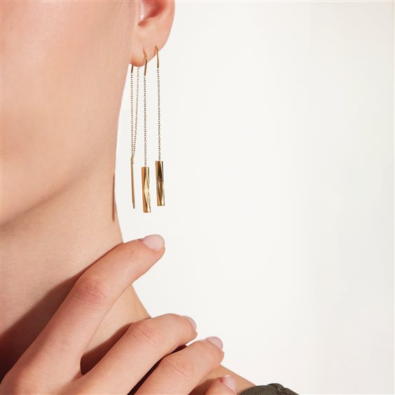 Gli orecchini pendenti Flow in acciaio color oro sono super attuali e completano in menira raffinata ogni look. La costruzione di questi gioielli è tale da permettere un indosso confortevole e sicuro: la struttura centrale è infatti definita da un archetto rigido che mantiene la posizione dell'orecchino una volta infilato. Il pendente riprende l'elemento caratteristico della collezione, un piccolo cilindro irrgolare e sinuoso che incornicia delicatamente ma con carattere il volto.