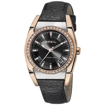 Orologio Breil con cassa in acciaio rosè mm 34 contornata di cristalli e sfondo nero, datario. Attacco cassa in policarbonato trasparente, cinturino in pelle nera. Corona e fondello a vite WR 10 atm. 2 anni di garanzia.