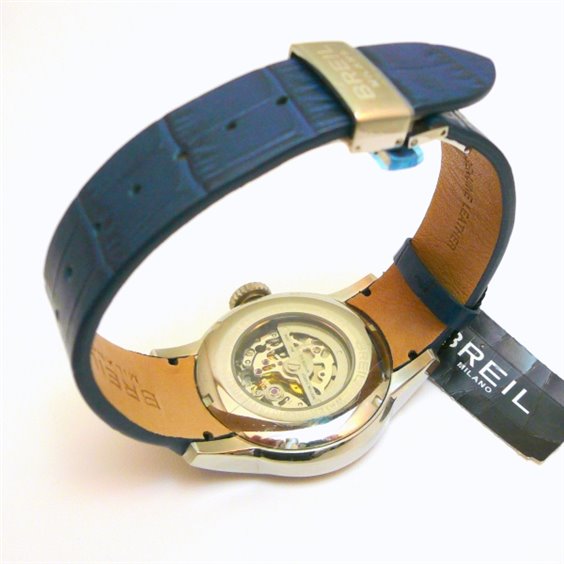 Orologio Breil Globe automatico con cassa in acciaio tonda e cinturino in pelle blu.