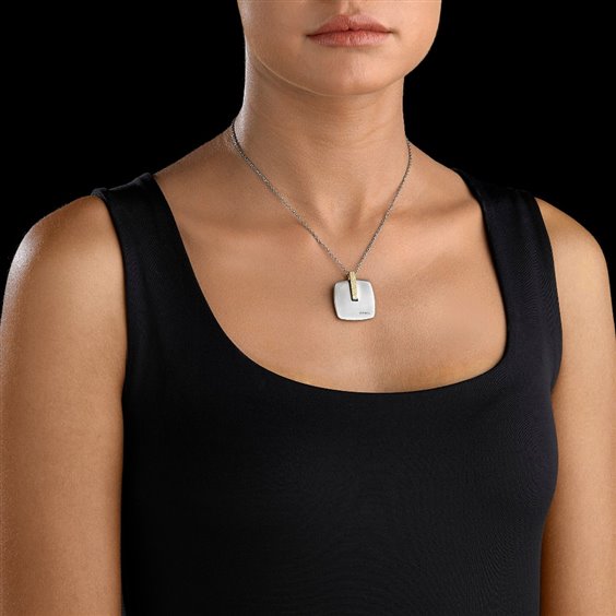 Collana in acciaio con ciondolo quadrato e inserto in acciaio dorato bulinato.