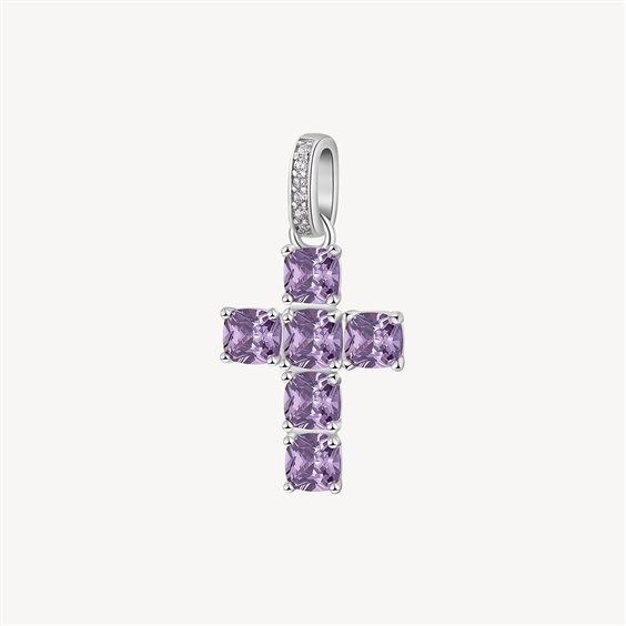 Pendente a forma di croce in argento rodiato 925‰ con cushion cubic zirconia colore amethyst.