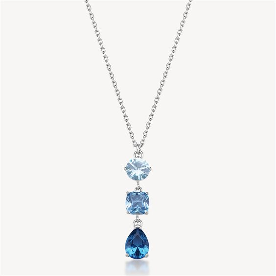 Collana girocollo in acciaio 316L e pendente con round, cushion e pear cubic zirconia colore light sapphire.