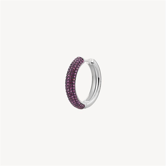 Orecchino singolo a cerchio in argento rodiato 925‰ con galvanica colore rutenio e cubic zirconia colore ruby.