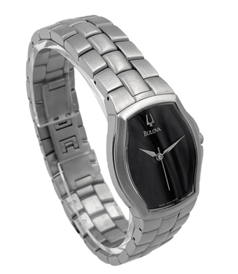Orologio DONNA BULOVA, Dimensione Cassa 25X 30 mm in acciaio, di Forma Rettangolare, Movimento Quarzo swiss made, Vetro minerale, Quadrante nero, fondello con viti, corona a scatto. Cinturino in Acciaio, Chiusura Cinturino a farfalla. Resistenza all'acqua 3 atm/30mt