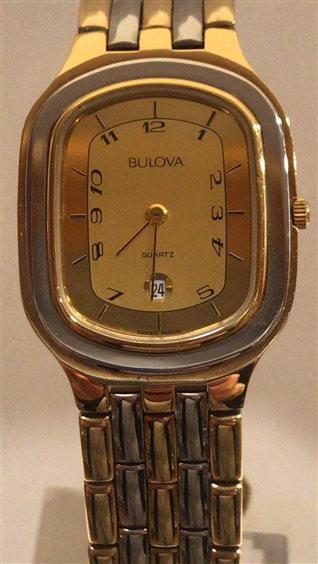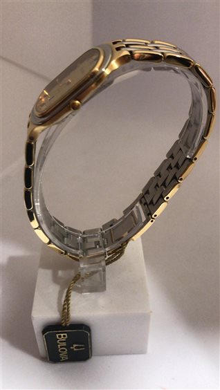 OROLOGIO BULOVA CASSA E CINTURINO IN ACCIAIO QUADRANTE FONDO DORATO SOLO TEMPO DATARIO POSIZIONATO AL NUMERO 6 CHIUSURA DEPLOYANTE.