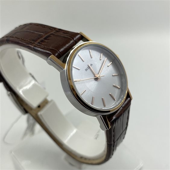 OROLOGIO BULOVA DONNA CON QUADRANTE BIANCO, SFERINE ORO ROSA, AL QUARZO, DISPLAY ANALOGICO, FUNZIONE SOLO TEMPO. CASSA IN ACCIAIO. CINTURINO MARRONE IN VERA PELLE. WATER RESISTANT.