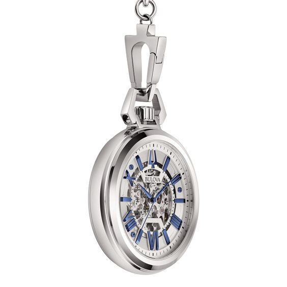 Orologio da tasca Bulova 96A304 Edizione Speciale. Presenta movimento meccanico a carica automatica 8N24-43A con funzione ore e minuti. La cassa è in acciaio dal diametro 50 mm e spessore 10,7 mm. Il quadrante scheletrato al centro con indici alternati a numeri romani in color blu. Lancette blu. Vetro minerale convesso. Catena in acciaio da 38 cm con moschettone di chiusura.