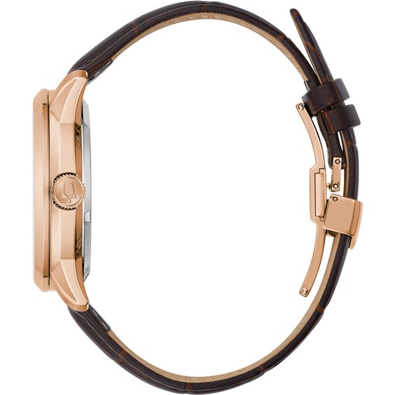 Orologio solo tempo da uomo di Bulova della collezione sutton automatic. Orologio con cassa in acciaio ip gold con diametro di 43 mm. Il cinturino è in pelle finitura coccodrillo marrone con chiusura deployante. Il quadrante ha indici a tacche. Il movimento è automatico. La resistenza all'acqua è di 3 atm. La referenza è 97A169.