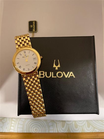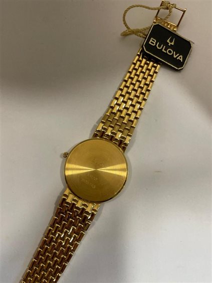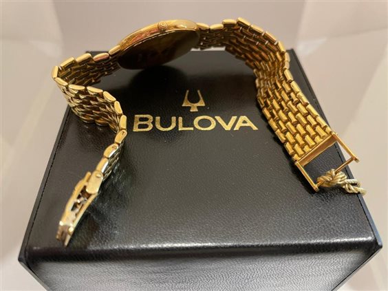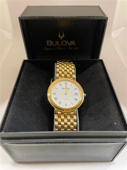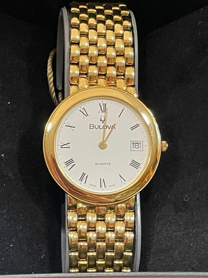 Orologio Bulova Unisex cassa e cinturino in oro giallo Kt 18, solo tempo con fondo bianco e numeri romani con datario posizionato al numero 3.