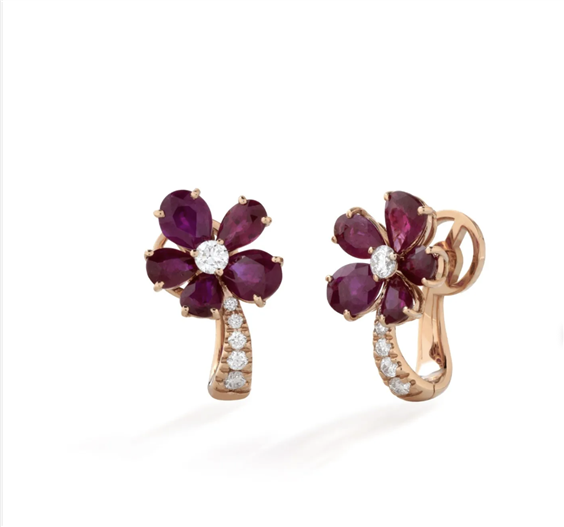 Coppia orecchini oro rosa monachina d.bianchi fiore con rubini a goccia