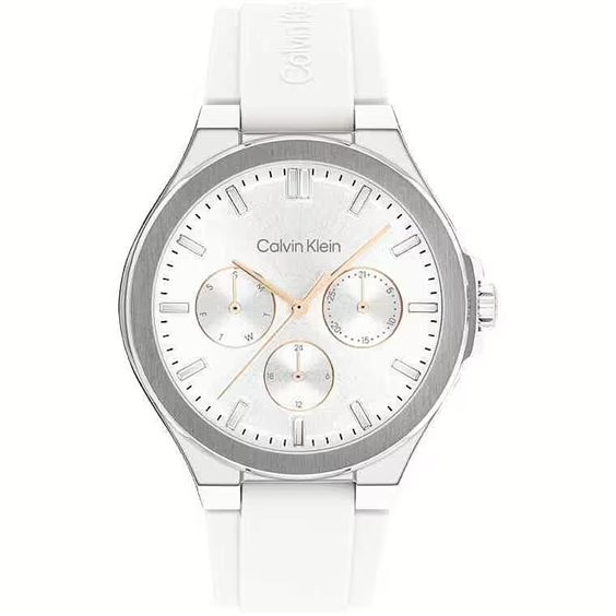 Orologio da donna di Calvin Klein della collezione Vibrancy. Orologio con cassa in acciaio di colore silver , dimensione cassa di 38 mm, cinturino in silicone di colore bianco, resistenza all'acqua di 3 atm e movimento multifunzione