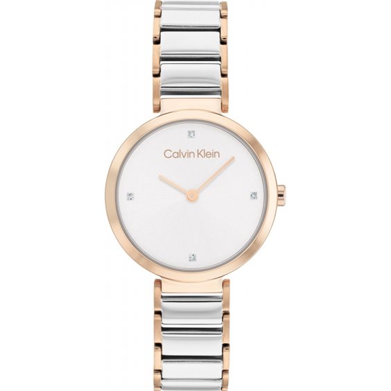 Orologio con movimento al quarzo e funzioni di solo tempo. Cassa rotonda in acciaio inox placcato oro rosa dal diametro di 28 mm e spessore di 6 mm. Quadrante bianco con due lancette e cristalli bianchi a ore 3, 6, 9 e 12. Cinturino bicolore in acciaio anallergico silver e rose gold. Chiusura con fermaglio di sicurezza. Resistente all'acqua fino a 30 metri di profondità. Appartiene alla collezione Timeless Minimalistic T-Bar.