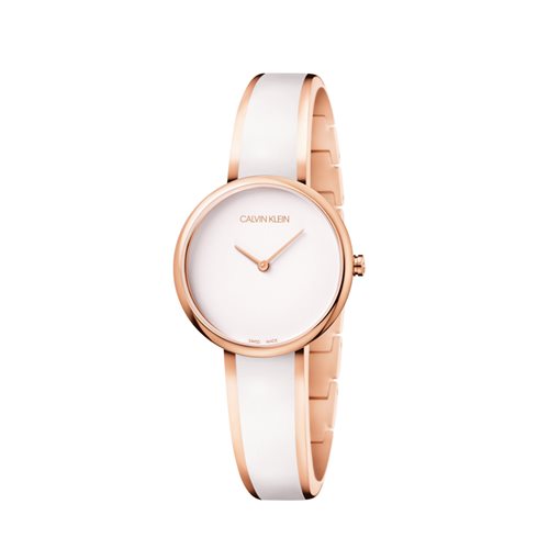 Orologio donna Calvin Klein nuovo modello Seduce in acciaio PVD Oro Rosa. Movimento al quarzo analogico Swiss Made con funzione ore e minuti.Cassa rotonda in acciaio PVD Oro Rosa rifinito lucido diametro mm. 30,00 e spessore mm. 8. Fondello in acciaio PVD rosa chiuso a pressione ed impermeabile fino a 3 ATM. Corona in acciaio pvd rosa logata CK. Quadrante bianco con lancette ore e minuti in metallo rosè lucido. Logo Calvin Klein a ore 12. Vetro minerale temperato Cinturino in acciaio inox PVD rosa rifinito lucido composto da due spezzoni rigidi + bracciale morbido largo mm. 8. Chiusura a scatto. Orologio nuovo accompagnato da cofanetto e garanzia di 2 anni originale Calvin Klein.