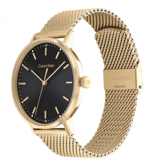 Orologio da uomo con movimento al quarzo e funzioni di solo tempo. Cassa rotonda in acciaio inox con finitura dorata dal diametro di 42 mm e spessore di 7,7 mm. Lunetta placcata oro rosa. Quadrante nero con indici a bastoni e logo nella parte alta. Cinturino in maglia milano d'acciaio anallergico color oro. Chiusura con fermaglio di sicurezza. Resistente all'acqua fino a 30 metri di profondità. Appartiene alla collezione Timeless Modern Mesh.