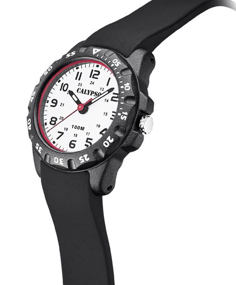 Orologio marca Calipso al quarzo con cassa in plastica nera, cinturino in silicone nero, quadrante bianco e numeri arabi.