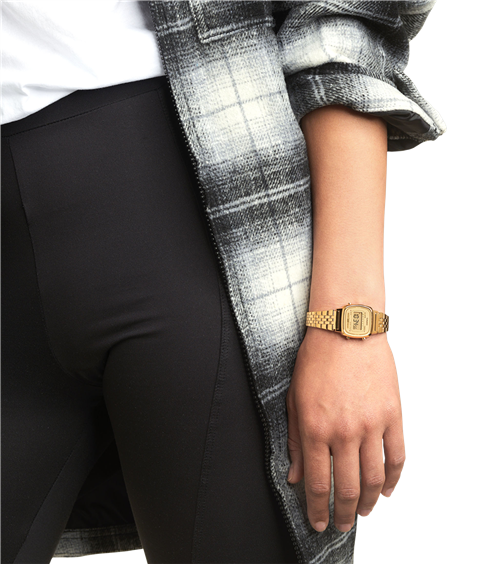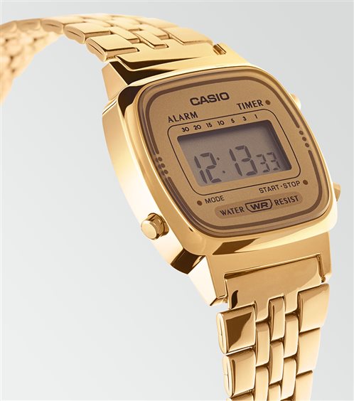 Orologio da donna Casio collezione Vintage ref. LA670WETG-9AEF. Cassa in resina IP oro giallo da 25mm, display digitale a cristalli liquidi, vetro minerale sfaccettato. Visualizzazione di ora, data e giorno della settimana. Cronometro, allarme giornaliero. Bracciale IP oro giallo in acciaio con chiusura regolabile. Impermeabile a norma DIN 8310 e/o ISO 22810 (spruzzi leggeri).Funzioni e caratteristiche Cronometro - Allarme giornaliero - Calendario automatico- Timer - Durata della batteria 2 anni - Dimensione cassa 30,3mm x 24,6mm x 7,3mm - Peso ca. 28 g.
