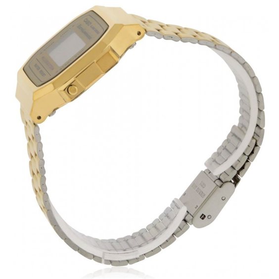 MODELLO: vintage retrò laminato oro. FUNZIONI: ora pm/am. calendario giorno/data. allarme. cronografo al centesimo di secondo.illuminazione quadrante al buio con luce AZZURRA. W.R. 50 metri. CARATTERISTICHE: cassa e bracciale in acciaio,chiusura a pressione, bracciale regolabile grazie a slitta chiusura scorrevole. fondello serrato da 4 viti. vetro minerale. DIMENSIONI: MM 35 X 38.