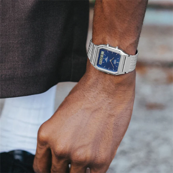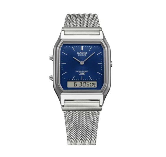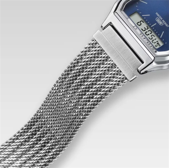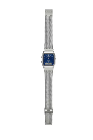 Una rivisitazione aggiornata di un classico intramontabile: l'AQ-230, combinazione analogico-digitale con quadrante angolare, è elegante con un cinturino in maglia Milano. Trattata con uno speciale processo di pressatura che aggiunge profondità e dimensione, la fascia in mesh offre un look raffinato e vintage e una vestibilità assolutamente confortevole per il polso. Scegliete un quadrante di colore navy o argento per completare la cassa argentata. Aggiornati con il cinturino in mesh, questi modelli classici rendono ancora più sorprendente la dichiarazione di stile, mettendo in risalto la bellezza della maglia metallica e offrendo una presenza raffinata ed elegante tutta loro.